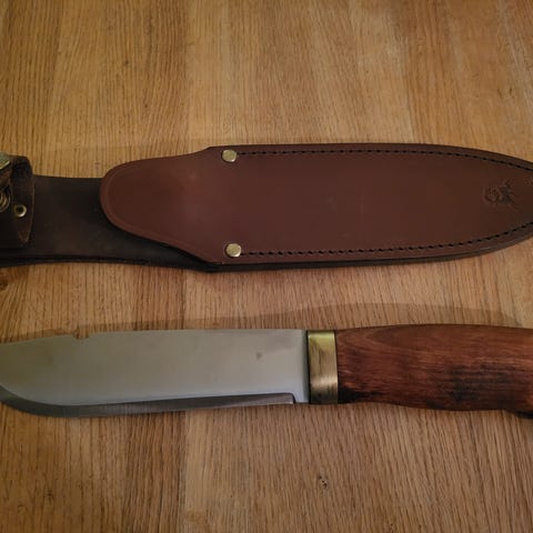 Ny Brusletto Villguten 440C kniv med fingerbeskyttelse selges. Kniven er totalt 28,5 cm lang med 16 cm blad. Sendes for kjøpers regning.