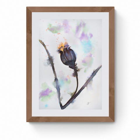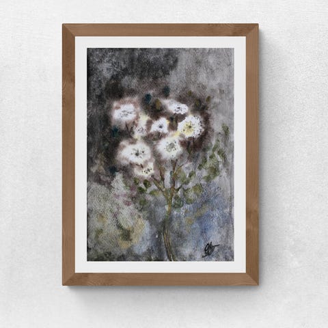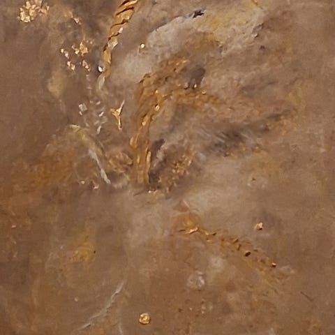 Malt i mange blå og blågrønne toner med detaljer i gull og diskret glitrende effekt.