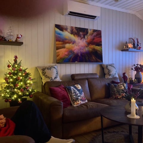 Juletre julestjerne julelys julepynt gjesteseng nisse engel sofa seng kommode sjenk konsollbord spisestue spisebord interiør dekorasjon
