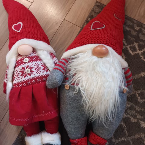 To nissefigurer med høye, røde strikkede luer dekorert med snøfnugg, hvitt skjegg og nese. Passer til juledekorasjon i hjemmet.