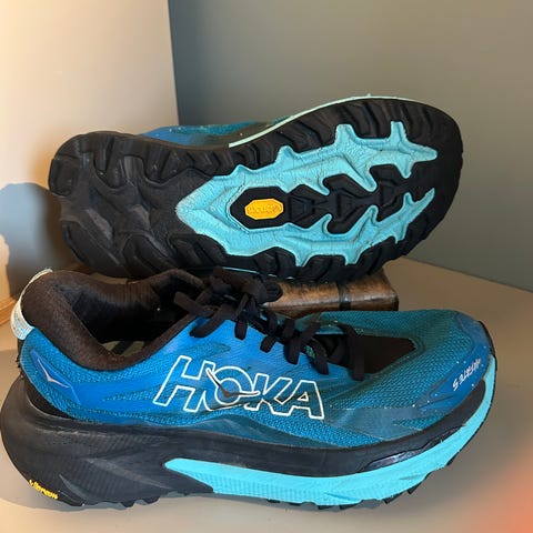 Hoka løpesko i størrelse 45 1/3 med blå overdel og gul såle. Egnet for løping.