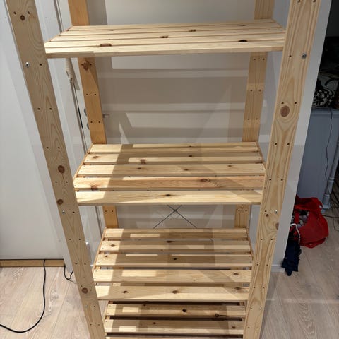 Selger 3 seksjoner av hyllesystem som har stått i kjelleren. Tror det er IKEA Gorm, som er systemet før Hejne.