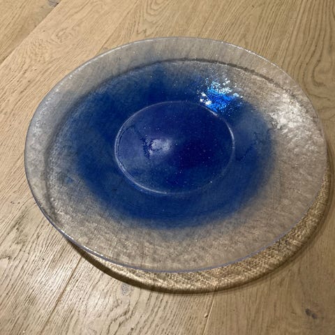 Turkis glassfat gis bort mot henting. 40 cm i diameter.