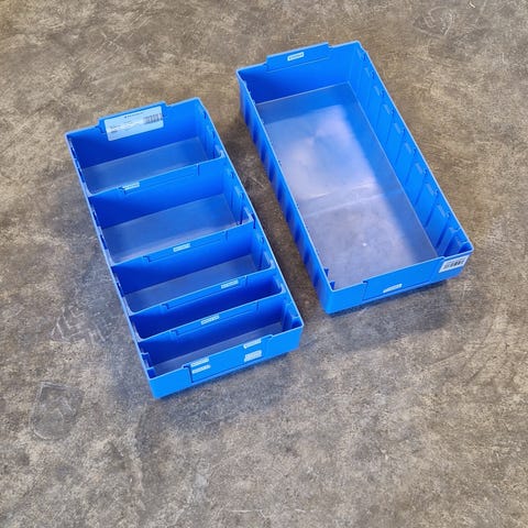 Sett med plastoppbevaringsbokser i grå og svart farge med veggmontering. Egnet for organisering og oppbevaring av små deler eller verktøy