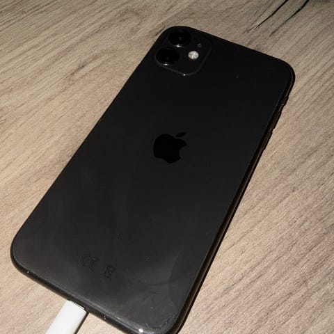 Apple iPhone 11 mobiltelefon med 64 GB lagringskapasitet. Den har skjermbeskytter og er lilla. Kan også få med dekselet om ønskelig. Batterikapasiteten er målt til 76 % av maksimal kapasitet.