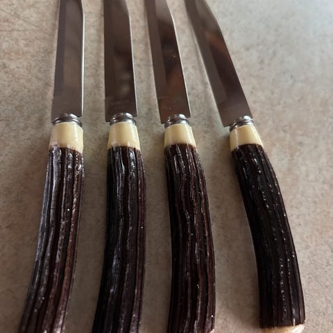 fruktkniver, fruktkniv, fruktknivsett, fruktbestikk, serveringsbestikk, serveringssett, vintage bestikk, retro bestikk, gammelt bestikk, tysk bestikk, Solingen, Solingen stål, Peter Schneider, Schneider Solingen, rustfritt stål, rostfrei, bakelitt, bakelittskaft, fenolplast, art deco, funkis, 1930-tallet, 1940-tallet, 1950-tallet, mellomkrigstiden, etterkrigstid, servering, fruktservering, dessertservering, kakespade, serveringsspade, kakekniv, forrett, borddekking, klassisk stil, kvalitet, samlerobjekt, samlerbestikk, original, ekte vintage, tidsriktig
