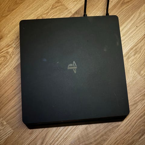 Sony Playstation 4 spillkonsoll med to trådløse lilla kontrollere. Konsollen har en svart overflate og kommer med nødvendige kabler for tilkobling. Passer til spilling på Playstation 4-plattformen.