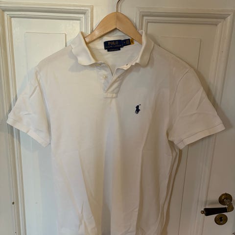 Ralph Lauren Custom Fit Polo T-skjorte i størrelse M. T-skjorten er rød og laget av bomull. Designet med klassisk krage og knappestolpe, egnet for menn. Dm for spørsmål.