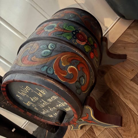Fatet har rikt dekorert kant med sirkel‑ og lenkemønster og varm brun patina som gir ekte hytte‑ og fjellfølelse.