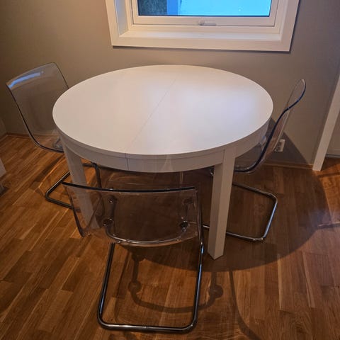 Jysk rundt spisebord i hvit farge. Bordet har en rund form og fire ben med en sentral støtte. Passer til spisestue eller kjøkken. 140cm med ekstra bordplate og 100 cm uten ekstra bordplate.