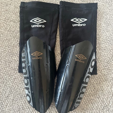 Umbro leggbeskyttere i hvit og svart farge. Utstyrt med justerbare stropper for sikker passform under fotballtrening eller kamper.