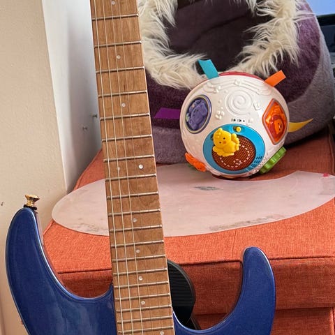 Kjøpt ny i jula 2023. Har fått noen battlescars, se bilder. Ellers i svært god stand. Pickupene er Seymour Duncan Distortions. Skikkelig hissige. God og smal D-hals, med compund radius 12’’-16’’.
