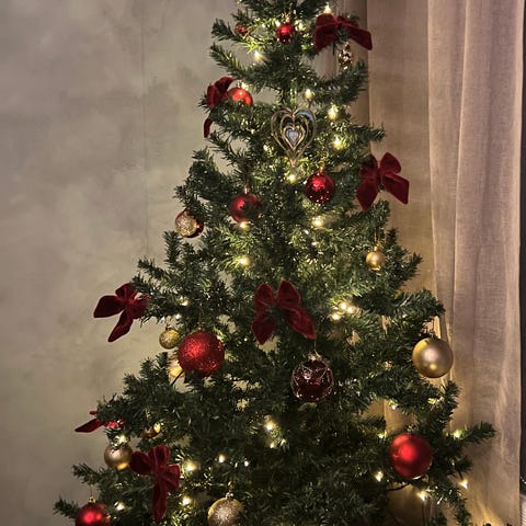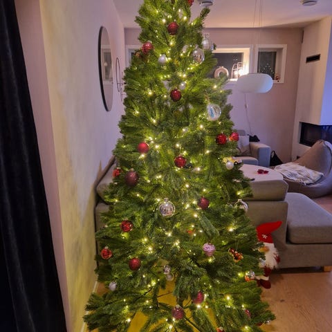 Selger et smalt juletre, 210 cm høyt, ca 90 cm i diameter, kjøpt på Plantasjen i 2021 for ca 2500 kr, brukt 3 juler. Selger fordi vi har flyttet til et større sted med plass til større juletre. Dette treet passer fint i leiligheter med liten plass.