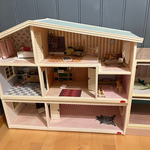 Lundby dukkehus med flere rom og detaljert interiør. Huset har et bassengområde med steinlagt terrasse, samt møbler inkludert sofa, lenestol, kjøkken og peis. Rommene har ulike farger og tapeter som gir variasjon i design.