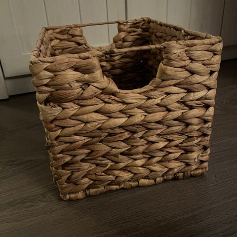 Selger en splitter ny og ubrukt kurv med hengslet lokk, «Espen», fra Jysk, laget av flettet naturmateriale.