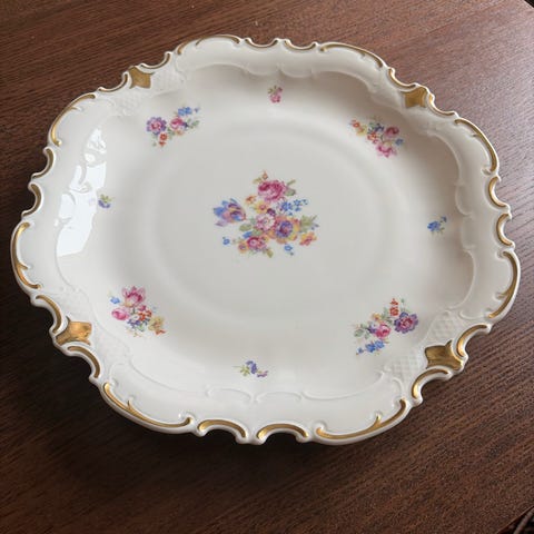 Rosenthal, Rosenthal Selb, Selb Germany, Rosenthal porselen, tysk porselen, serveringsfat, ovalt serveringsfat, fat 32,5 cm, stort serveringsfat, kakefat, middagsfat, anretningsfat, porselensfat, vintage porselen, retro porselen, klassisk porselen, antikk porselen, blomsterdekor, floral dekor, hånddekorert, håndmalt, gullkant, ekte gull, kremhvit porselen, borddekking, selskap, festservise, finservise, søndagsservise, samlerobjekt, samlerporselen, interiør, landlig stil, klassisk stil, romantisk stil, fransk landstil, cottage style, shabby chic, 1950-tallet, 1960-tallet, mid century, vintage kjøkken, europeisk porselen, kvalitetsporselen, servering, dekorfat, pyntfat, gaveidé, retro gave, bryllup, konfirmasjon, jul, høytid, tradisjonelt servise