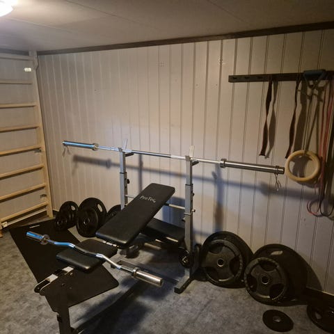 Halfrack med 20 kg stang, olympisk curlbar, juster bar benk og 127 kg skiver