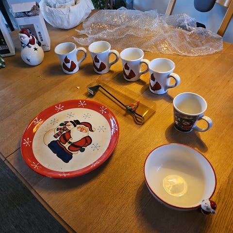 To julekopper/julekrus i minimalistisk stil. Gode til både te og kaffe. Glatte og fine i godset. Hvite kopper med detaljer i svart og gull. Like fine om de holdes med høyre eller venstre hånd da det er samme bilde på begge sider av koppen.