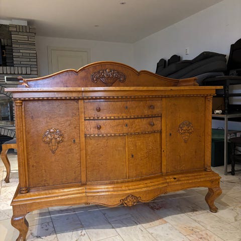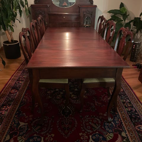 Spisestuebord med seks stoler, dekketøyskap og skjenk selges. Gammel spisestue i meget god stand. Stolene har seter trukket med brunt skinn. Må hentes på Råholt.