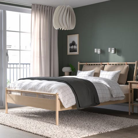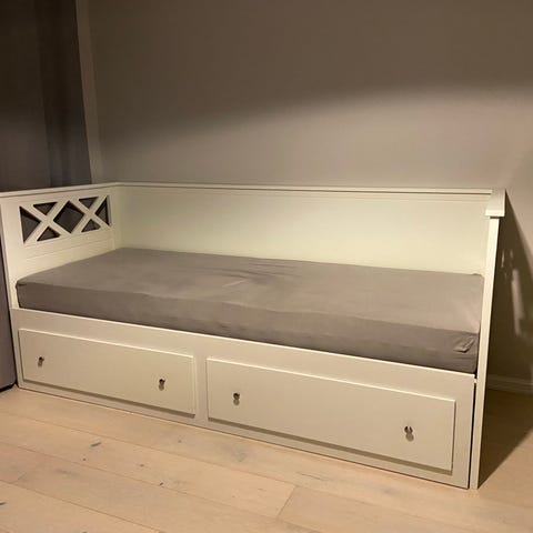 Fin madrass, sengeramme, sovesofa, kommoder, hyller, høy spisebord med stoler