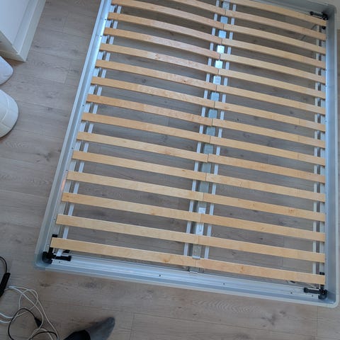 2) Alu sengeramme, veldig lite brukt, 150x200, selve ramme 10cm høy, hele høyde med bein 30cm, så du for skuffer under om du vil.