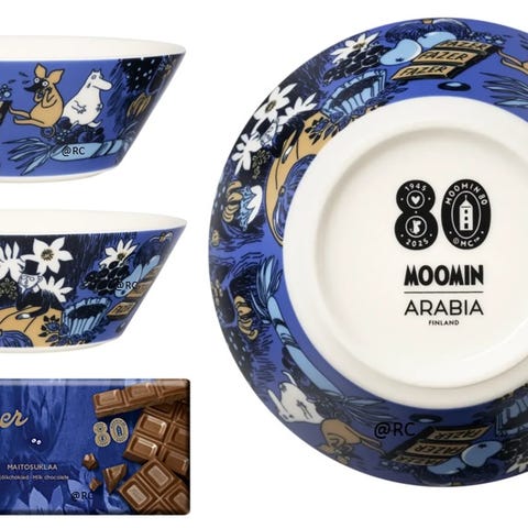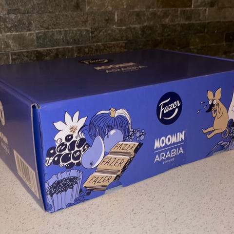 Esken inneholder en deilig Fazer sjokoladeplate og en limited edition mummi bolle med vakre tegninger. Skålen er en jubileumsutgave for å markere 80 års dagen til mummi og er produsert i begrenset opplag.