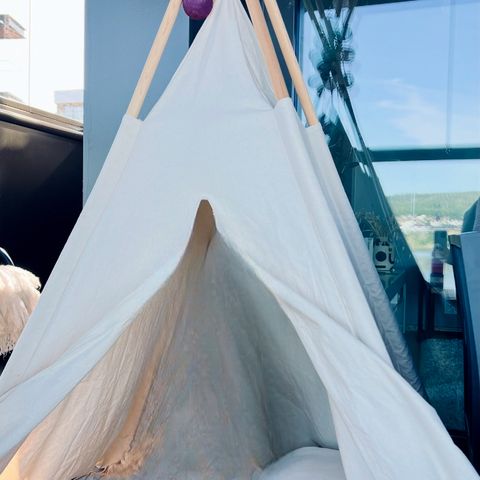 Minitude Barntelt laget av beige bomull. Teltet har en firkantet form med vindu på siden og åpning foran. Egnet for barn som innendørs lekeområde.