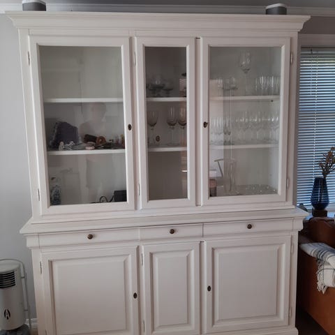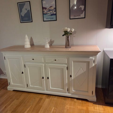 Bohus skjenk med fire skuffer og to skapdører. Møbelet er malt i hvit farge og har klassiske håndtak. Passer til oppbevaring i stue eller spisestue.