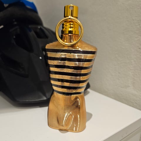 Jean Paul Gaultier Le Male parfymeflaske med en volum på 75 ml. Flaskeformet som en mannlig torso i blått glass med gullfarget hette. Leveres med original emballasje i grønn sylinderformet eske med rød topp. Har brukt 10 dusjer med parfyme.