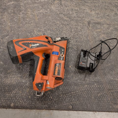 Paslode spikerpistol med batteri og lader. Verktøyet leveres i en oransje plastkoffert for enkel oppbevaring og transport.