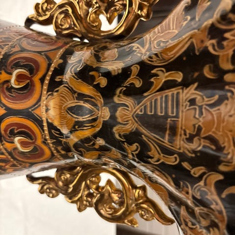Dimensjoner: 43 cm lang, diameter klokke 17 cm, 24 cm bred på det bredeste.