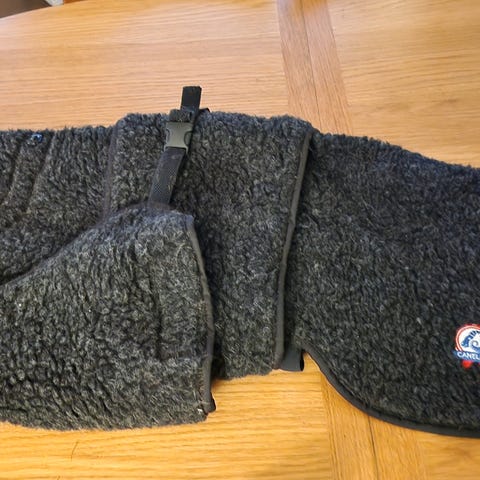 Hunden vår døde nylig, og vi gir bort diverse etter ham. Vann- og matskål i stål, en sele, en vinterdress (hårete), en krage, uåpnet neglesaks, «bilbelte», boks brukt til hundemat og potesokker (godt brukte!).