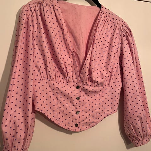 Bluse i rosa mønster, litt glitter i stoffet, str S
