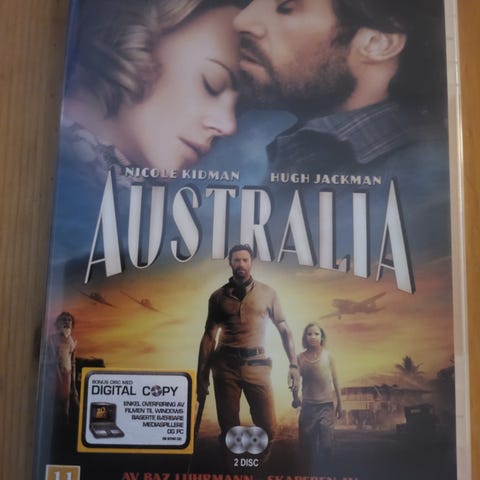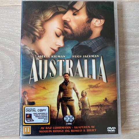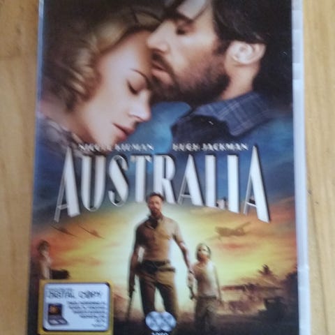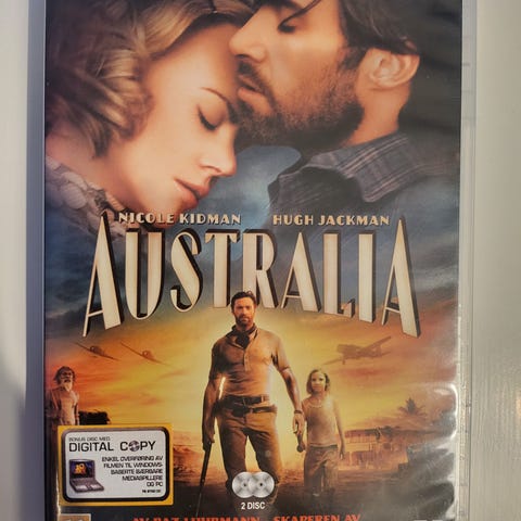 DVD-film med tittelen Australia, med skuespillerne Nicole Kidman og Hugh Jackman. Inneholder filmen regissert av Baz Luhrmann, kjent for verk som Skaperen av Moulin Rouge og Romeo & Juliet. Norsk tekst.