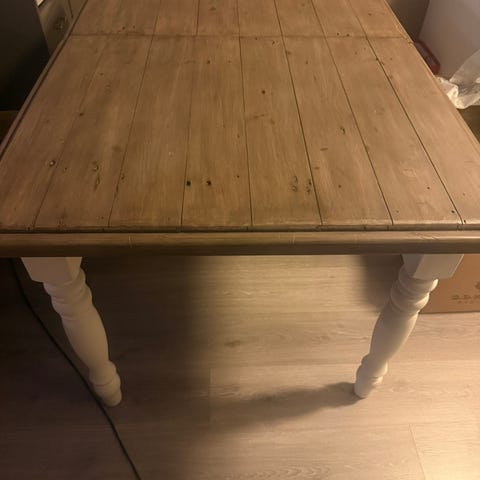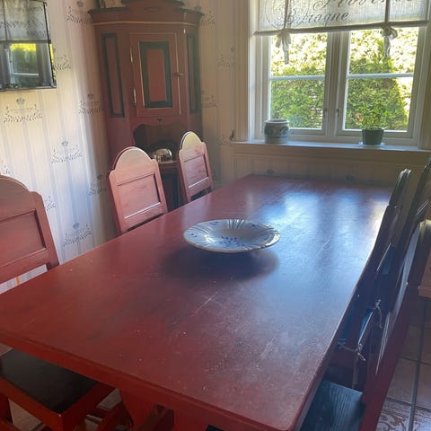 Bord med 6 stoler og seksjon .Bord med 2 plater blir 1,92 med plater .seksjon er 1,90 høy 1,30 bredde og 48 dyp .øvre del er 48 dyp