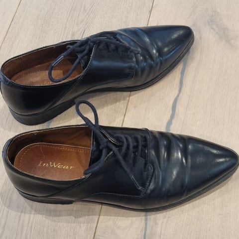Skoene er lite brukt men har noe bruksslitasje på skinnet, særlig foran på venstre sko.