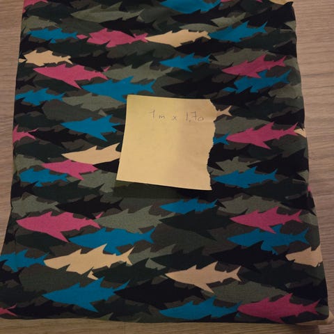 Jersey-stoff til å lage barnerartikler. Se på mål bilder. Det er ingen kapp tatt av. Selges for 100,- pr. del eller 150,- for begge samlet.