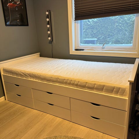 Utvendige mål er oppgitt! Madrassen som hører til er 75 bred og 200 lang.