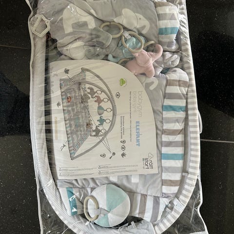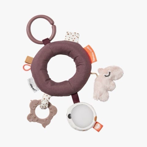 Done by Deer aktivitetsleke for barn med myke leker festet på en bue over en rund, polstret matte. Designet for å stimulere sanser og motoriske ferdigheter hos små barn.