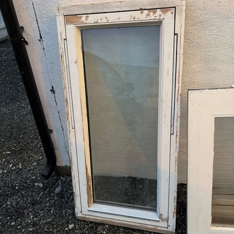 2stk Tre vindu med hvit ramme. Vinduet har hengsler og håndtak for åpning og lukking. 2 lags fra 1-86