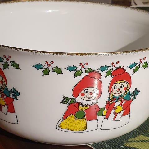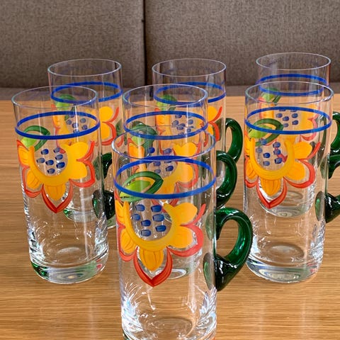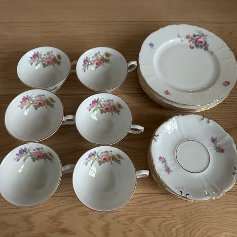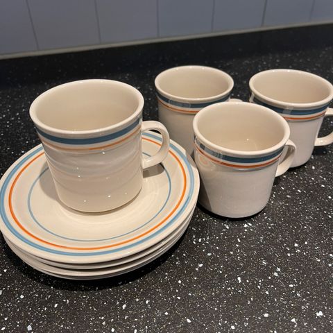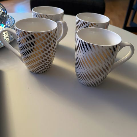 Hvitt,med gull kant og "riller" på siden. Tidløst