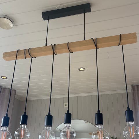 Armene er fleksible og kan justeres i vinkel, og høyden er enkel å regulere med den medfølgende stålvaieren (justerbar oppheng). Super til høye tak, trappeoppgang, over spisebord, kjøkkenøy eller i stua – den sprer lyset jevnt og blir et skikkert blikkfang!