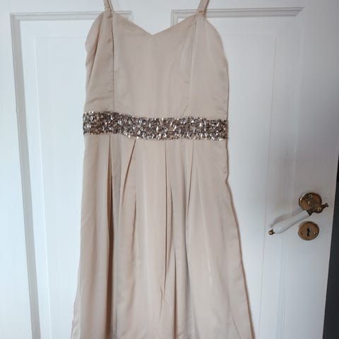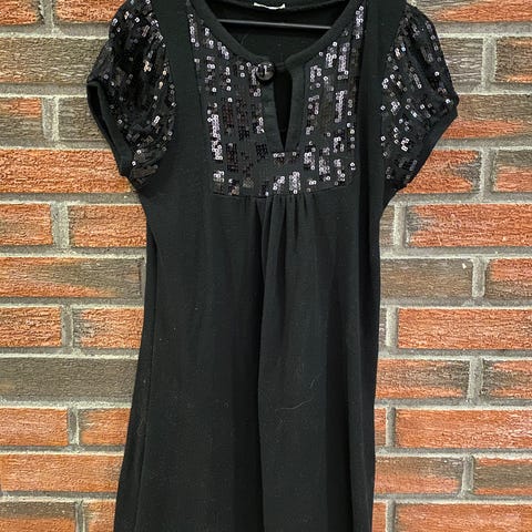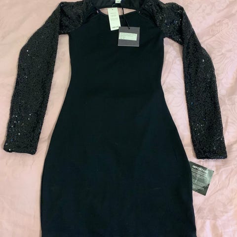 Kort paljettkjole i str. 32/34 fra KappAhl. Jeg er 170 cm høy, og den går til lårene. Den er stretchy i stoffet. Jeg bruker vanligvis 36. Se bilder for detaljer/anmerkninger.
