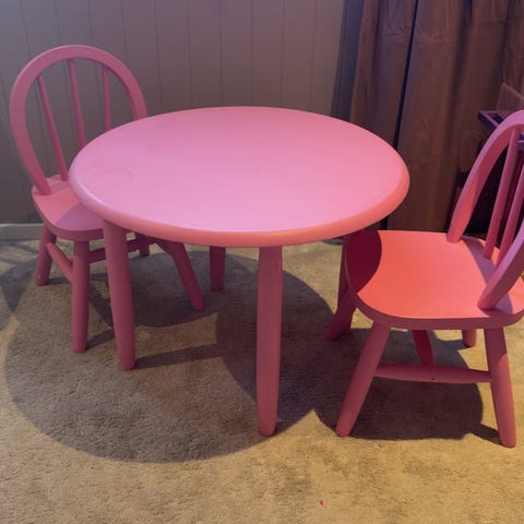 Bord og stoler til små barn. Litt merker og et klistremerke eller to.