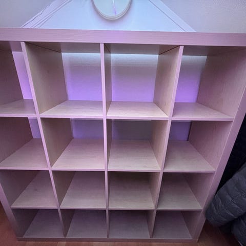 Tre bokhylle i lyst tre med flere hyller for oppbevaring. Passer til organisering av bøker, dekorasjoner eller annet utstyr. Har en vakker buet ramme og dekorative runde treben.