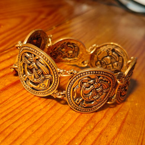 Stener: Dekket med glitrende zirkoniastener og en større sentral opal-lignende stein.