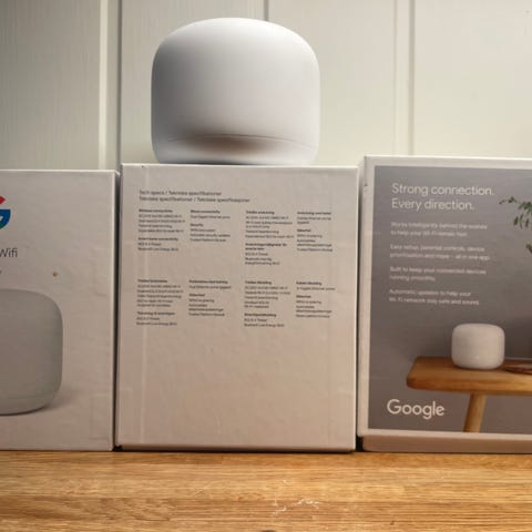 3x Google Wifi mesh Router. trådløs ruter med to Ethernet-porter for kablet tilkobling ved behov, eller for trådløs forlengelse/forsterkning av internett hjemme. Kommer med strømforsyning. Designet for å gi stabil og pålitelig trådløs nettverkstilkobling over større områder. Fungerer fint! Model AC-1304