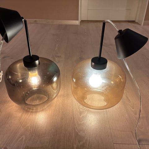 6 taklamper gis bort. Enkelte av glassene på de lange lampene har knust, har ingen ting å si for bruken. De fleste spottene lyser, men noen trenger ny pære.