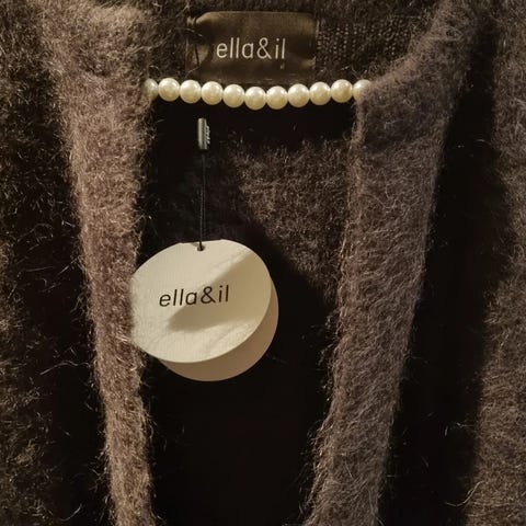 Som ny cardigan. Ikke vasket, så den har fremdeles den opprinnelige strukturen i strikken🌸str L, men passer også godt M. Den er nesten sort/ mørk marine. Cardiganen har belte i livet for justering av passform.