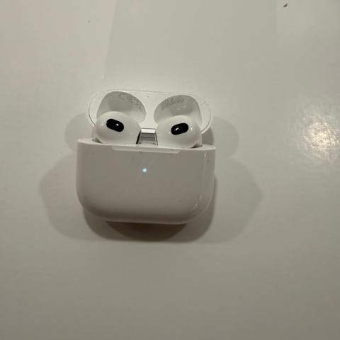 Original Apple AirPods 3 trådløse hodetelefoner med ladeetui som fungerer ut,erket med trådløs lading eller ladekabel.